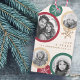 Winter holiday gift tags with your custom photos on colorful circles. Customizable text "Love and peace", and your family name.