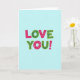 This card features the words “LOVE YOU!” centered on a soft pastel blue background. The message is set in big, chunky letters with an exclamation point, so it’s the first thing you notice. The letters alternate between hot pink and chartreuse green, giving the design a fun, upbeat look. Inside the pink letters, there are delicate swirls and curling patterns that feel like little decorations. Inside the green letters, you’ll see layered shapes and splashes of teal, yellow, and deeper greens that add extra detail and energy. With no characters or scenery, the simple background keeps all the focus on the message and makes it feel direct and honest ❤️. It’s a meaningful card to give because it says exactly what you want to say, while still looking special and thoughtful 🥰. Hope it helps you share your Valentine’s Day feelings with someone you care about.