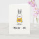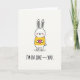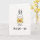 This card shows a simple drawing of a white rabbit standing in the middle of an off-white background. The rabbit has its eyes closed, pink cheeks, and a small calm smile that feels shy and sweet ❤️. It’s holding a bright fuchsia heart close to its chest with tiny paws, making the heart the main focus 💘. The rabbit wears a sunny yellow top, and thin black outlines define its shape clearly. A soft gray shadow under its feet helps it feel grounded on the page. Near the bottom, the card reads “I’M IN LOVE — YOU.” in a hand-drawn style, in black, placed under the rabbit. The dash in the middle makes the message feel like a little pause, like someone saying it softly 😘.