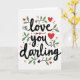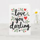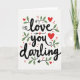 This greeting card features the words “love you darling” in flowing black lettering across a bright white background. The phrase sits centered on the front, with “love” above “you,” and “darling” below, so your eyes move through it easily. Small red hearts are sprinkled around the words, and one heart replaces the dot over the “i” in “darling.” Another heart appears above “you,” with a thin arrow pointing toward it, which makes the message feel direct and tender. Slender green leafy sprigs curl around parts of the lettering, along with a few tiny red berries that add a gentle pop of color. The mix of black text, red hearts, and green leaves feels romantic and caring without being over the top ❤️. It’s a meaningful card to give because it says what you feel in a simple way and still looks special 🥰, making it easy to share Valentine’s Day sentiments.