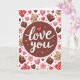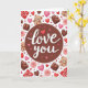 This greeting card features the words “love you” in white lettering centered inside a rich earthy brown circle, making the message feel close and intimate ❤️. Around it, a bright white background is sprinkled with smiling teddy bears whose gentle faces suggest cozy hugs and easy affection 🥰. Hearts in deep red, soft pink, and chocolate brown drift across the space, creating a romantic pattern without feeling crowded. A red gift box with a neatly tied ribbon sits among the icons, like a small surprise waiting to be opened. Nearby, little chocolate treats add a sweet, date-night touch alongside the softer symbols. Pink roses unfurl with delicate petals, balancing the simple shapes of the hearts and candies. The text stays centered while the surrounding illustrations are scattered evenly around it in a light, airy layout. The roses appear in pale to medium pink tones with subtle shading, and the gift’s ribbon curves in smooth loops against the white background.