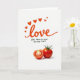This Valentine’s Day card features a white background with the word “love” written large across the top in orange-red cursive script. Around the word are small red hearts scattered like confetti, adding a sweet, romantic touch ❤️. Just below, the card reads “YOU FROM MY HEAD TO-MA-TOES” in dark green, handwritten-style letters that feel friendly and funny. The bottom half shows two red tomatoes on a simple surface, lit softly with gentle shadows underneath. One tomato is whole with a green stem on top, and the other is cut in half, showing yellowish seeds and juicy red sections inside. The tomatoes look fresh and glossy, and the cut one hints at sharing what’s in your heart
