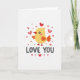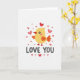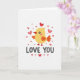 This card shows a cute, stylized yellow bird standing inside a soft white circle, like a gentle halo around it. The bird has a plump lemon-yellow body, one big black eye, and a small pink blush on its cheek that makes it look a little shy 🥰. Its tiny red beak and orange wings and tail add warmth, and two simple red feet sit underneath like little crosses. All around the bird, small hearts float in the background, in shades from deep red to light pink, giving the scene a sweet, loving feel ❤️. The background is plain white, which keeps everything easy to see and puts the focus on the bird and the hearts. Near the bottom, the words “LOVE YOU” appear in dark gray, simple printed letters, centered under the picture. It feels meaningful to give because it’s straightforward and tender, like a small way to say “I’m thinking of you” without needing a lot of extra words. Hope it helps you share your Valentine’s Day feelings in a kind, honest way.