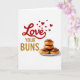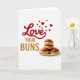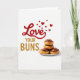 This greeting card features a white background with a stack of cinnamon buns in the lower right corner that look warm and freshly baked. The buns are golden brown with dark cinnamon swirls, and they’re topped with a glossy glaze that makes them look extra sweet 🍫. On the left and upper middle, the card reads “Love YOUR BUNS.” The word “Love” is written in red script, and small red hearts float around it like little accents ❤️. Under that, “YOUR BUNS” appears in block capital letters in a golden yellow tone, making the message easy to read. The overall layout is simple and roomy, with the pastries and the message getting all the attention 💌.