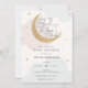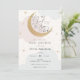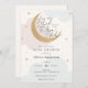 Baby Shower-inbjudan med vattenfärgsfärg rosa och blå moln och stjärnor med guld glittery måne och roligt-skript "Du är älskad i måne och tillbaka!" Anpassa med informationen eller klicka på "klicka för att anpassa ytterligare" för att justera teckensnittstypen, storlek, färg.