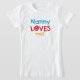 Nanny Kärlek Me T-shirts, kort, klistermärken, kostymer och annat med färgstarkt rött, gult och blå text och hjärtdesign. Nanny Kärlek, mina kläder och presentartiklar gör nanny le!