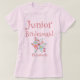 En underbar souvenir för din junior bridesmaid som tjänstgör i bröllop, den här rosa skjortans visningar "Junior Bridesmaid" skriven överst i rosa roligt font. Undernaturen är en rosa och blå blombukett med hennes namn personlig vid grund. Ställe din beställning i dag! Bouquet Artwork skapat av: AMBillustrations http://www.etsy.com/shop/AMBillustrations/