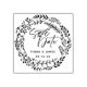 Unikt design gummistämpel med borstskrift "spara datumet" med modern typografi och lövkrans.