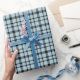 Denna pappra omslutning har ett övergivet mönster med skärande vågrät och lodrät linjer i blå och vit nyans. Utformningen har en klassisk och tidlös dragningskraft med varierande linjetjocklek som skapar djup och struktur. Den symmetriska och jämnt fördelade rutnätsliknande layouten gör den visuellt slående samtidigt som den behåller ett förfinat utseende och elegant. Det är ett mångsidigt val för inslagning av presenter, som passar både formellt och avslappnad tillfälle.