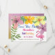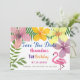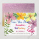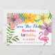 Sätt igång festen med det här livfulla tropiska ”Spara datumet”-kortet för din lilla flickas 1-årsdag! Med akvarell hibiskusblommor, palmlöv och en lekfull rosa flamingo är denna glada luau-inspirerade design det perfekta sättet att låta gästerna veta datumet i förväg. Personalisera med ditt barns namn och evenemangsinformation. Perfekt för sommarfödelsedagar, hawaiianska fester eller bakgårdsluaukelebrationer!