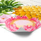 Luau Hawaiian-temat bröllop med tropisk blad, plumeria, hibiscus, ananas och vit bakgrund av tvättat trä.
