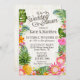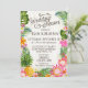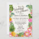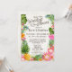 Rustiskt strandluau-tema med tropisk blommigt med inbjudningskort för möhippa av plumeria, hibiscus och ananas.