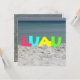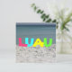 En inbjudan med ett bakgrundsfoto av en strand med vit sand och blå vatten. Texten lyder "LUAU" i multifärgaden öarnas typsnitt. Bakgrundsfoto på det blå havet vatten är motsatt. Anpassa med information om händelsen.
