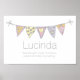 Söt som buntar flaggor art namn poster perfekt för ett flickors sovrum eller lekrum i skuggor av grått, vitt, gult, rosa och lila. Med ditt barns egen initiala buntning i mitten mellan flagga, namn och namn så att ditt barns sovrum eller daghem blir ordentligt berört i personligen, är detta exempel för namn Lucinda. Cute poster utskrift som passar perfekt för en nyfödd bebis-, ristening- eller babyduschpresent. Unik konst och design av teckning och grafik från Sarah Trett. www.sarahtrett.com för www.mylittleeden.com