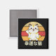 Färgfull illustration med "Lucky cat"-textdesign på japanska och en Kawaii-katt som höjer ena dekorationen på den raderade bakgrunden
