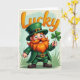 This card features a happy leprechaun standing front and center, smiling as if he’s sharing a friendly secret with you 💚. His bright orange beard and mustache frame his grin, and his green eyes catch the light in a way that feels warmly inviting. He wears a deep emerald suit with a tall green hat, each finished with a shiny gold buckle, plus a black belt and sturdy brown boots. Held forward in his hand is a neat four-leaf clover ☘️, offered like a small, sweet token between friends. Behind him, the background fades softly from pale mint green into creamy beige, giving the scene a gentle, airy setting. Across the top, the word “Lucky” curves overhead in chunky, 3D-style orange lettering that stands out against the light backdrop. Near the bottom edge, a few simple blades of grass sit at the base while tiny light specks float near the upper background.