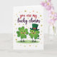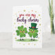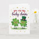 This card shows two smiling four-leaf clovers standing close together on a gently wavy patch of light green, their leafy bodies shaded from soft lime to deeper emerald 💚. Their simple black dot eyes and rosy cheeks make them look like they’re sharing a sweet, private joke, with their curved smiles turned slightly toward each other. The clover on the right wears a small deep-green leprechaun hat with a shiny gold buckle, giving it a festive, slightly proud look ☘️. Above them, the words “you are my lucky charm” curve in an arc across the top, with “you are my” in a rich red and “lucky charm” in a darker plum. The background is bright white, leaving lots of open space that keeps the pair in the spotlight. Scattered around them are small five-point stars in soft gold and warm orange, sprinkled like confetti across the scene. A few stars sit near the top corners while others float around the clovers’ heads and along the sides, balancing the open white space.