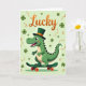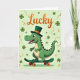 This card shows a cheerful green dinosaur rolling along on a dark green skateboard, its wide eyes and toothy grin turned outward like it’s inviting a friend to join the fun 💚. It wears a tall leprechaun-style top hat in deep emerald with a bright orange band, matching the orange wheels beneath its feet. Soft blush marks on its cheeks and a tiny hint of red in its smile add a sweet, friendly warmth to the character. The dinosaur fills the lower half of the design in layered shades of green, steady and confident as it balances on the board. Behind it, a light lime-green background sets an easy, sunny tone, sprinkled with darker shamrocks and curling golden ribbons that loop through the space ☘️. Near the top, the word “Lucky” sits centered in large gradient orange lettering, standing out clearly against the pale green. The shamrocks cluster in different sizes around the dinosaur while the golden ribbons sweep diagonally across the background.