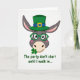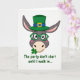 This card shows a cartoon donkey’s head centered on a bright white background, dressed up for St. Patrick’s Day with an emerald green top hat and a small gold buckle. Matching green-rimmed glasses frame its expressive eyes, and a soft blush sits on its cheeks as it gives a slightly flirty, upturned smile 💚. A four-leaf clover rests gently between its lips ☘️, like it’s offering a lucky kiss to someone just off to the side. The simple, open space around the character keeps all the attention on its face and festive accessories. Near the bottom, the phrase “The party don't start until I walk in…” is placed in green lettering, standing out clearly against the white. The artwork uses smooth, crisp lines and solid color fills, keeping the look neat and easy to read. The hat’s green dominates the top of the design, while the clover and glasses echo that same green tone around the donkey’s mouth and eyes.