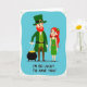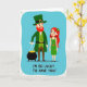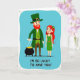This card shows two stylized figures standing close together on a smooth cerulean-blue background, with a friendly St. Patrick’s Day look 💚. On the left is a tall, lean leprechaun-like character in layered green clothing and a green top hat with a gold buckle, topped off with a bushy red beard. He lifts a black pot brimming with shiny gold coins, and the way he angles it toward his companion feels like a sweet, show-and-tell gesture. Next to him, a slender woman with flowing red hair smiles toward him, wearing a simple green dress and a small green flower tucked into her hair ☘️. Their near-touching stance and her attentive gaze add a gentle, affectionate note to the scene without needing anything else in the setting. Below the characters, the phrase “I’M SO LUCKY TO HAVE YOU!” is placed in all caps, set in green lettering against the blue field. The coins gleam in warm yellow-gold above the dark pot, and the hat buckle mirrors that same gold accent.