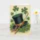 This card features a dark emerald green top hat set slightly off-center, with a shiny gold band and a bronze-red bow whose ribbons drape gently over the brim. A gold walking stick with a curved handle rests diagonally across the hat, like it’s leaning in close, adding a friendly, almost courtly touch between the two objects. Around them, shamrocks and four-leaf clovers fill the scene in many sizes and shades of green, forming a thick cluster near the bottom and scattering more lightly into the background ☘️. The lighting is soft and diffused, creating mild shadows that give the hat and cane a rounded, touchable look. The background shifts from creamy beige near the top to a pale green wash below, with a faint painted-paper texture that keeps everything gentle and cozy 💚. There’s no character face, yet the careful placement of the cane against the hat reads like quiet companionship, as if they’re sharing the same lucky moment. Any greeting text would sit best near the top in warm gold to echo the band, while the lower half stays filled with clovers and the red bow ribbons trailing over the brim.