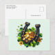 Ett vykort med en "St. Patrick's Day"-temabild. Ett svart och guld sitta i en säng av grönt klöver med glansigt guld mynt.