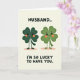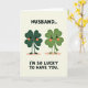 This card shows two anthropomorphic four-leaf clovers standing close together on a soft, creamy background, their bodies angled inward like they’re sharing a private joke 💚. The left clover is a deeper emerald green, while the right one is a lighter lime green, giving them a gentle contrast that’s easy on the eyes. Each has wide, bright eyes, a big smile, and small orange blush circles on their cheeks that make their connection feel tender and a little bashful ☘️. Their thin, stick-like arms and legs keep the look simple, and their feet rest above faint oval shadows that lightly anchor them to the page. At the top, “HUSBAND..” appears in black, all caps, centered and spaced to stand out against the pale background. At the bottom, “I’M SO LUCKY TO HAVE YOU.” is also in black, all caps, centered, and set in a larger, easy-to-read style that balances the top line. The two clovers’ warm expressions and matching blush make them read like a devoted pair, framed by lots of open space around them. The scene stays uncluttered, with the only extra details being the soft shadows beneath their feet and the crisp black lettering above and below.