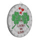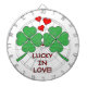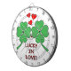 Lucky i kärlek. Teckning av klöver med fyra löv med hjärtformer som flyter över dem.