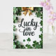 This card shows the phrase “Lucky in love” centered on a bright white background, written in a dark, flowing font that feels like a quiet promise between close partners. Around the edges, a border of shamrocks and four-leaf clovers wraps the message in layers of green, from pale sage to deep forest, like a shared walk through fresh spring leaves 💚. The clovers vary in size and overlap slightly, creating gentle depth and the sense that each leaf was placed with care, the way someone might fuss over a small gift for a friend. The layout keeps the words in the middle while the greenery draws your eye around the frame, giving the message room to breathe without feeling empty. At the top center sits a golden satin bow, its soft shine catching the light like a finishing touch on a present meant for someone special ☘️. The text stays crisp against the white space, while the green border forms a lively ring that guides attention back to the center. The bow’s loops and tails are neatly arranged, with smooth folds and a warm metallic glow above the clover frame.