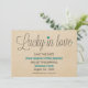 Rolig och charmig Lucky in Love Spara datum-annonsering med en fantasifull typografidesign kompletterad med små turkosa hjärtan och en falsk texturerad pappersbakgrund. Denna eleganta spara-datum-inbjudan är perfekt för att tillkännage din bröllopshändelse med modern stil! Lätt att anpassa, lägg bara till detaljerna om din speciella dag i de angivna fälten. Klicka på "Anpassa"-knappen för att hitta fler anpassningsalternativ.