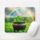 Grönt fyra löv i klöver i en gammal svart vattenkokare i klöver fält med regnbåge