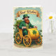 This St. Patrick's Day card shows a jolly, ruddy-bearded man in a forest-green suit and matching top hat, looking off to the right with a small, friendly smile that feels like it’s meant for someone close 💚. He sits snugly inside a shiny golden, barrel-shaped cart that resembles a pot of gold turned into a little ride, with sturdy wooden wheels beneath it. A bright four-leaf clover is displayed on the side of the cart, like a lucky badge he’s proudly showing to a friend ☘️. The lighting is bright and even, making the greens and golds stand out against the calm scene. Behind him, an azure sky holds soft, painterly clouds above patches of deep green shamrock-filled foliage that curl into the edges of the picture. Near the top, a golden banner stretches across with the words “Best Wishes” written in a flowing style, the letters set in a darker tone for contrast. The golden cart has a smooth shine, the wheels show warm wood grain, and the clover emblem sits centered on the cart’s side.