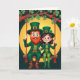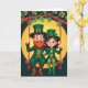This card shows two cheerful leprechaun-like figures cuddled close on a rustic wooden swing, their fingers linked as they lean into each other with easy affection 💚. The swing hangs from a sturdy tree branch by deep red ropes, and the pair sit side by side as if sharing a quiet joke. He has a fiery red beard, a tall green top hat with a gold buckle, and a protective posture turned slightly toward her. She wears a matching green outfit with a smaller green hat marked by a tiny shamrock, plus a neat bow tie that adds a sweet touch ☘️. Behind them, a large glowing golden orb fills the background, lighting the scene against a dark green twilight. Above, the branch is decorated with clusters of four-leaf clovers, with small red hearts dangling among the leaves. The title text sits near the top in green lettering, while the warm gold glow frames the swing and the red ropes stand out against the shaded canopy.