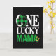This greeting card features stacked, centered text reading “ONE LUCKY MAMA” on a deep black background, with the words arranged in neat tiers that guide your eye from top to bottom. The “O” in “ONE” is replaced by a three-leaf shamrock, its heart-shaped leaves filled with a green-and-black buffalo check that adds a cozy, down-to-earth touch ☘️. “ONE LUCKY” appears in crisp white lettering, while “MAMA” sits just below in a rich emerald green that feels like a warm nod to St. Patrick’s Day 💚. A small golden horseshoe rests near “MAMA,” angled upward like a little charm tucked close for someone you care about. With no characters on the scene, the affectionate tone comes through in the way the lucky symbols lean in toward the word “MAMA,” like a gentle hug made from icons and type. The layout stays tightly centered, keeping the message front and forward, with the shamrock acting as the focal point at the top. The black backdrop leaves plenty of breathing room around the white and green text, making the shapes and colors stand out sharply. The final visual detail is the tiny gold horseshoe sitting beside the green “MAMA,” glowing softly against the dark background.