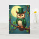 This card shows a well-dressed, humanlike owl perched on a sturdy branch beneath a moonlit, deep-teal sky, with a few ☘️ shapes glowing around it. The owl wears an emerald green top hat, a matching bow tie, and a fitted jacket, like it’s dressed up for St. Patrick’s Day. Its large golden-amber eyes catch the light and seem to linger on you with a gentle, friendly attention, like a quiet invitation to stay close. Cream feathers on its chest fade into rich brown around its face, and its orange talons grip the branch with steady confidence. Glowing four-leaf shamrocks thread along the branch’s curves, adding little points of green light that feel like shared secrets in the dark. A greeting sits near the top in light green lettering, standing out against the night sky, with a smaller line of text placed near the bottom in a softer mint tone 💚. Behind everything, a full moon shines with a pale halo while tiny stars scatter across the background and a small nest rests just below the owl on the branch.