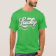 Den här t-shirt-roligten innehåller text i stil som säger "Lucky" i en tryckt grönt och vitt teckensnitt. Perfekt för att fira St. Patrick's Day!