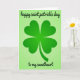 This card shows a large four-leaf clover in rich emerald green at the center, with gentle shading that gives it a little depth. Each rounded leaf resembles a soft heart shape, and they meet closely in the middle like a couple leaning in, with a slim stem extending downward. The background is a pale lime green with a light, grainy texture that feels like fabric or fine paper. Above the clover, the phrase “happy saint patrick’s day” sits near the top in flowing black lettering, and below it, “to my sweetheart” appears in the same black style near the bottom. The dark text against the light green backdrop keeps everything easy to read while letting the clover stay the main focus. The mix of greens feels fresh and springlike, and the sweetheart line adds a gentle, affectionate tone 💚. A small ☘️ detail is echoed in the clover’s heart-like leaves and the softly speckled lime background.