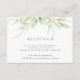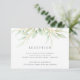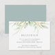 Designat för att samordna med vår lufsig botaniska bröllopssamling, har detta snygga gröna och vita mottagningskort en spray av pastellgrön lövverk och blad som toppar din mottagning information, tid och adress.