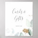 Den luftiga grönskan och guldbelagda bladskylten för kort och presenter är perfekt för ett modernt bröllop eller möhippa. Den eleganta botaniska designen har ljust och luftigt akvarell-eukalyptus med accentuerande lekfulla gnistrande guldbelagda blad. Textraden längst ner på skylten kan anpassas med datumet, brudens och brudgummens namn eller ett kort meddelande som "Tack". Skylten kan användas för ett bröllop eller någon annan tillställning eller fest.