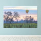 Ett serenlandskap har en gult luftballong som flyter i en pastelllandskap himmel ovanför en vinodling. Vinodlingen ligger i förgrunden, med växtsrader och obart träd som silhuetteras mot det mjuka ljus som gryningen eller skymningen ger. Himmel är en blandning av blek blues, pinks och whites som skapar en fredlig atmosfär. Ballongen tillför en liten bit stollig till den annars lugna scenen.