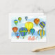 Ett "Hej" vykort för att hålla kontakt med färgstarka luftballonger som flyter högt i himmel på en fredlig grumlig dag som illustreras med vattenfärg.
