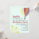Ett födelsedagsfest inbjudan med en illustration av en luftballong på översta högerna och sol på lämnat grund. Anpassa texten med information om tillfälle. Leta efter matchande artiklar på Jill's Paperie.