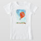 En orange i färgad, en luftballong som transporterar 2 silhuetter. Himlar är en kombination av snurrande pinkar och blues och marken nedanför täcks av berg och en skog av träd.