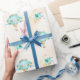 Luftballong i turkos, teal, aqua, guld, gult och grått med ro på vattenfärgsbakgrund i guld.