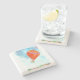 En orange i färgad, en luftballong som transporterar 2 silhuetter. Himlar är en kombination av snurrande pinkar och blues och marken nedanför täcks av berg och en skog av träd.