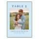 Det här bröllopsbordskortet har ett lugnt och naturligt landskap med två individer som omfattar varandra, mot en mjukt suddig bakgrund av böljande kullar och gröna fält. Designen är inramad av en ljusblå kant som skapar en lugnande atmosfär, medan typografin använder sig av feta serif-typsnitt i djupblått för en elegant touch. Anpassningsbar text möjliggör personlig anpassning med namn och datum, vilket gör den perfekt för att lägga till en personlig detalj på din speciella dag. Den övergripande stämningen är varm och inbjudande, idealisk för att fira kärlek och gemenskap vid formella evenemang eller betydelsefulla milstolpar.