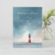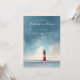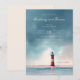 Denna bröllopsinbjudan har ett lugnt strandtema med en fyr som centralpunkt, placerad mot en gradient himmel som övergår från mjukt blått till ljusare nyanser nära horisonten. Färgpaletten omfattar dämpade blåtoner, gråa nyanser, sandigt beige och röda färger för fyrens ränder, vilket skapar en lugn och romantisk atmosfär. Elegant typografi används genomgående, med anpassningsbara sektioner för namn, datum och platser, vilket säkerställer personlig anpassning samtidigt som en ren och sofistikerad layout bibehålls. Designen frammanar en känsla av värme och intimitet, perfekt för par som vill fira sin speciella dag i en kustnära miljö.