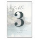 Det här bröllopsbordskortet har en lugn insjöscen med klippiga stränder och städsegröna träd, utfört i en mjuk akvarellstil. Designen använder en lugnande färgpalett i ljusblått och grått, kompletterat med djärva, mörkt turkosa typografi för bordnumret "3" och elegant kursiv skrift ovanför det. Anpassningsbara textfält möjliggör personalisering med namn och datum, vilket gör det perfekt för att lägga till en touch av naturinspirerad elegans till din händelse. Det övergripande humöret är lugnt och inbjudande, idealiskt för att skapa en sofistikerad atmosfär på din speciella tillställning.