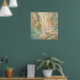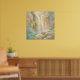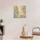 Konstverk av en vattenfallsklipp i en pastell målarstil. Denna konst visar en mild vattenfall som forsar nerför soldränkta klippor, insvepta i ett mjukt, dimmigt ljus. Scenen är fylld med frodig, mjuk lövverk och badad i varmt solljus ovanifrån. Utförd i en stil som påminner om mjuka pasteller eller krita, suddar verket ut gränserna mellan verklighet och fantasi. Denna pjäs kännetecknas av sin belysning och mjuka, impressionistiska texturer, vilket skapar en ljus och obetydlig fokuspunkt. Sammanspelet mellan salvia grönt, dammiga lila och varma sandiga toner skapar en lugnande atmosfär som känns som ett bleknat, lyckligt minne. Perfekt för ett barnrum eller något