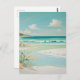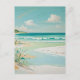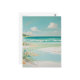 En lugn och ljusfylld målning av en avskild strandscen. Kompositionen är uppdelad i en mjuk himmel med fluffiga vita moln, en vidsträckt turkosblå ocean med mjuka, skummande vågor och en sandstrand. Stranden är en mjuk krämvit och vit, med subtila intryck av vatten som rinner över sanden. I förgrunden tillför en klunga stiliserade gröna och ljusblå växter en touch av naturlig detalj. Bakgrunden visar en avlägsen grön kustlinje under den klara himlen. Stilen är flytande och mjuk, med en harmonisk palett av pastellblå, gröna och vita nyanser som frammanar en fredfull, drömlik atmosfär.
